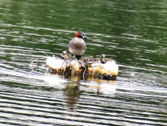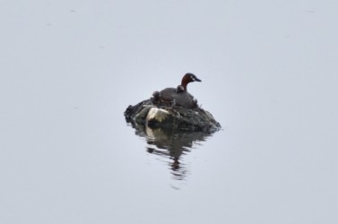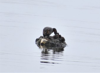 カイツブリの番(つが)いは、通常の巣造りする材料のヨシ、マコモや水草がないので、発砲スチロールの箱を巣に利用しています。