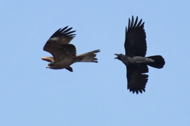 空中のカラスの動きが敏捷なのに、トビは動きが大きいことが原因ではないかと思われます。