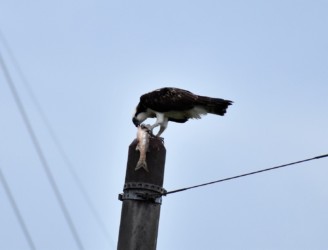 電柱の上で周りをいつも気にしながら獲物を頭から食べていきます。