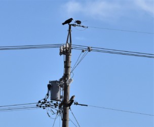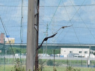 運動場のネットの上に止まっていたチョウゲンボウの近くに、1羽のカラスが止まりました。