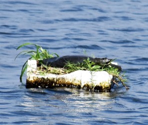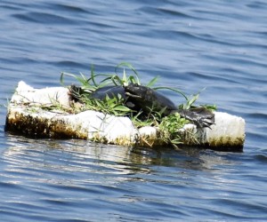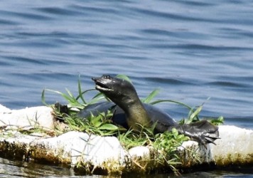 そろそろ子育てが終わるかなと思って、その巣の様子を見に行ったら、その発砲スチロールに黒い大きなアシカかイグアナに見える動物が乗っていたのです。