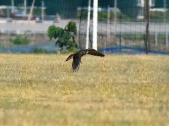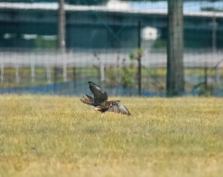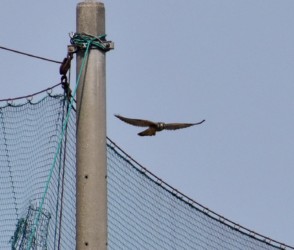 チョウゲンボウはそのネットを支えるコンクリート柱の上や、ネット上の網に止まって、下の芝や畑の様子をじっと見ています。