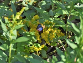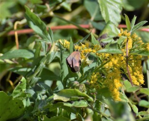 セイタカアワダチソウの花の吸蜜をしていたかどうかは不明ですが、飛んでセイタカアワダチソウの別の花にもとまりました。