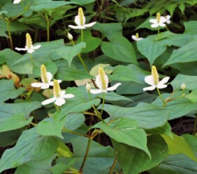「日本の野草」(林弥栄編 山と渓谷社)には「平地の日陰にごく普通に生える多年草。特有の悪臭がある。地下茎は長くはって群生する。和名は毒痛みであろうという。民間薬としてよく知られ、10種の薬効があるから十薬との説もある。茎は高さ15~30㌢。葉は心形でやわらかい。茎の先端に淡黄色で、雄しべと雌しべだけの花を短い穂状につける。花びらのように見えるのは総苞片である。花期6~7月 生育地 道ばた、野原 分布 本、四、九、沖。」と記されています。