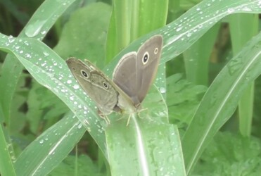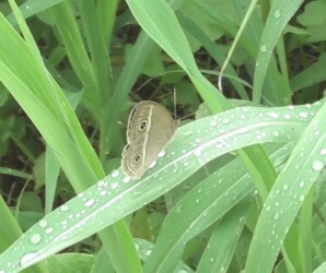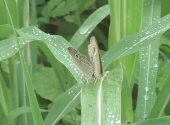 小雨の中でジャノメチョウたちは活発に飛んだりとまったりを繰り返していました。