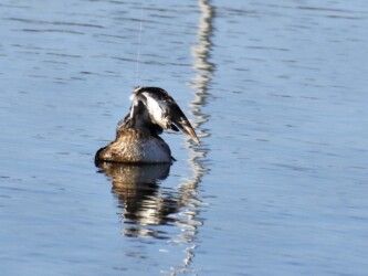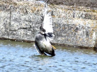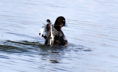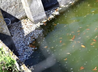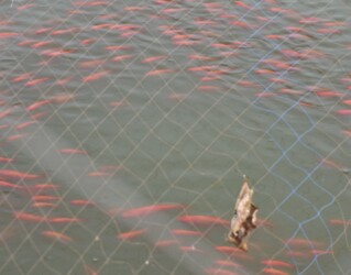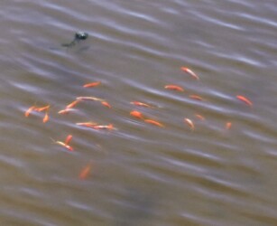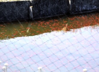 金魚を育てる池には上にテグスを張り、池の水面近くにはネットを張りしてカワウ、カモ類やサギから守っています。