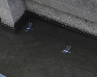 シオカラトンボやギンヤンマは飛翔しながら水面に体をぶつけたり水を飲んでいるような仕草をしています。