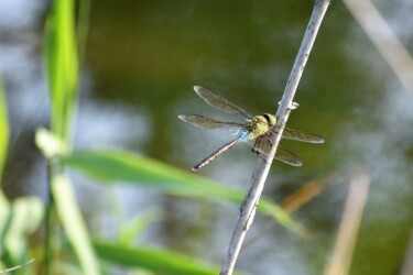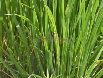 ギンヤンマは壁にはとまらないで、用水路の上の叢の葉陰にとまっています。