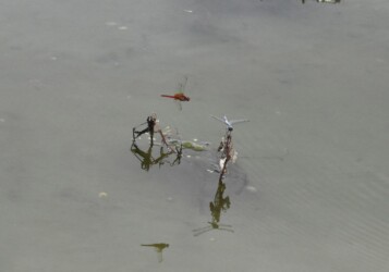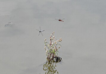 どのトンボも水辺に来て交尾して産卵しますが、シオカラトンボに比べてコフキトンボとショウジョウトンボは未成熟の時から水辺近くで生活する傾向が強いようです。