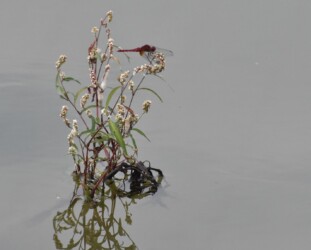 池には抽水植物やイネが偶然生えていて、水面から出ているそれらの枯れ枝に、ショウジョウトンボやコフキトンボがとまります。