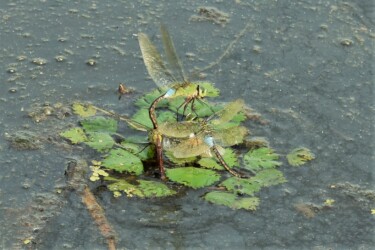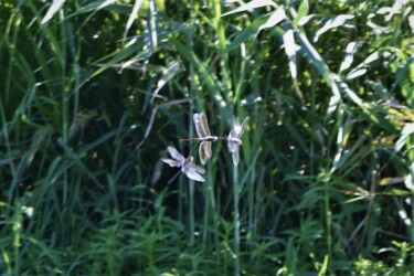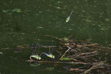 ギンヤンマは飛翔しながら縄張りを巡回して、他のオスが来ると追いかけて2匹が高く飛び上がって、そして戻ってきます。