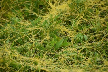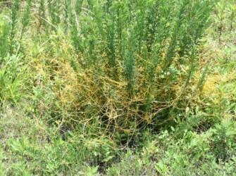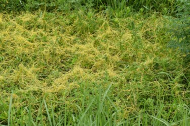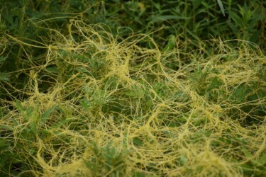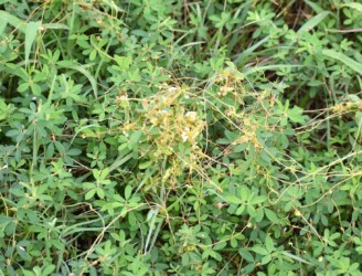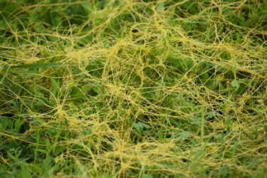 近くで見ると黄色いツルで草に巻きついたり、草の上に紐状でたくさん被っているのです。