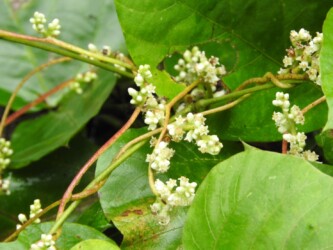 「野草・雑草の事典530種」(金田初代 洋一郎 西東社)には「葉緑素をもたない寄生植物で、ヨモギ、クズ、ススキ、イタドリなどさまざまな植物に寄生します。地上に芽を出したときは根がありますが、他の植物に巻きつくと根がなくなり、つる性の茎から寄生根を出して養分や水を吸収して成長します。葉は退化してこまかな鱗片状になり小さな白い花が茎の途中に穂状にたくさんつきます。」と記されています。