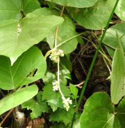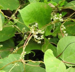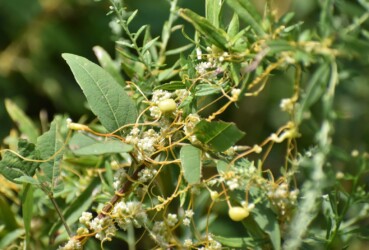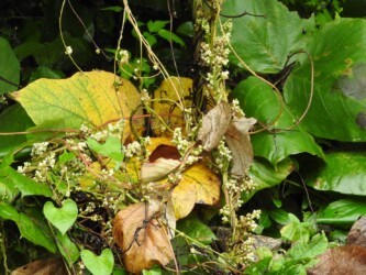 「日本の野草」(林弥栄 山と渓谷社)にはヒルガオ科ネナシカズラ属として、マメダオシ、ネナシカズラとアメリカネナシカズラの3種類が載っています。今のところどれだか同定できていません。そこでネナシカズラの部分を見ると「日当たりのよい野や山の草や低木に巻きつく1年生の寄生植物。茎は太さ約1.5㍉で黄色を帯び、普通褐色の斑点がある。葉は小さなりん片となる。花は茎の途中に多数穂状に付き、鐘形で長さ3.5~4㍉となり、先は5裂する。蒴果は卵形で長さ約4㍉、先端に花柱が1個つき、はじめ花冠がかぶさっているが、やがて頭をだし、上部がふたのようにとれて少数の種子を散らす。花期8~10月 生育地 山野 分布 日本全土。」と記されています。