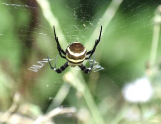 今年の9月過ぎに海津市ハリヨ公園近くの津屋川の土手近くで、ナガコガネグモが巣を張っているのを見かけました。