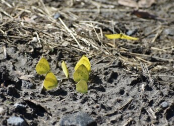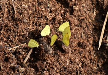 このキタキチョウは秋の9月半ばから10月に入ると、道路上や泥地、牛糞置き場などで集団吸水しているのを見かけます。