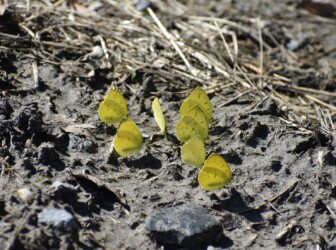 この集団吸水しているキタキチョウはオスだけらしく、確かに翅の色が濃い黄色なのでオスだと分かります。