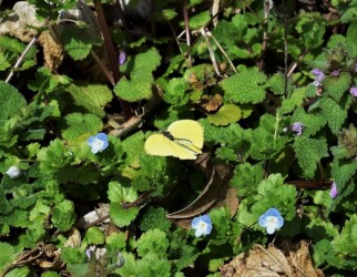単なる仮説でしかありませんが、キタキチョウのオスはこうした有機物や無機物を摂取して、他の季節ならいろいろな花の蜜で得られた性フェロモンの材料を、地面に下りて仕方なく吸収しているのではないかと思うのです。