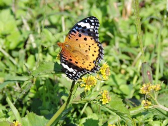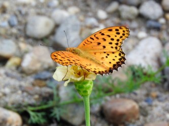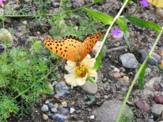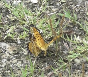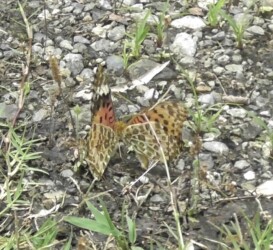 このハリヨ公園でも自宅の庭でも、ツマグロヒョウモンのオスがメスに迫る場面を何回も見かけたものの、ほとんど交尾に至らないままオスが飛び去ってしまいました。