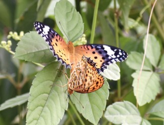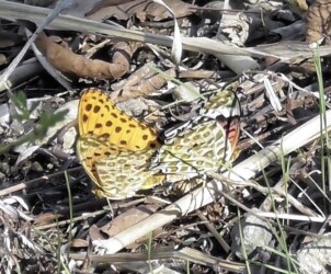 ハリヨ公園のツマグロヒョウモンのオスは、懸命に尻尾を曲げてメスの尻尾と接合しようとしますが、メスは応じないままじっとしていました。