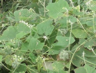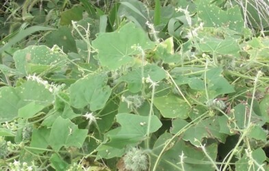 「野草・雑草の事典530種」(金田初代 洋一郎 西東社)には「北アメリカ原産の帰化植物です。1952年に静岡県の清水港で初めて見つかりました。巻きひげで絡みながらつるが長く伸びます。雌雄同株で、黄白色の雄花は長い柄に、雄花より小さい淡緑色の雌花は短い柄につきます。名前は荒地に生えるウリの意ですが、とげ状の長い毛と軟毛に覆われ、数個がかたまってついた果実には、ウリには見えません。生息地は荒地、河原、土手。分布はほぼ全国。花期は7~9月。高さはつる性。花色は黄白色。」と記されています。