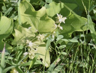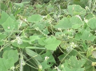 仕方なく叢の中を突っ切って堤防に上がろうとしたのですが、その途中アレチウリが群生して花を咲かせている場所がありました。