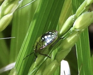 永和の雑木林周辺の田んぼでは、その未成熟のイナホに取りつくカメムシもいます。