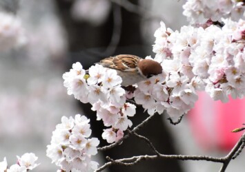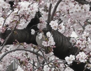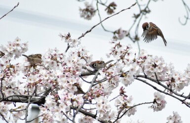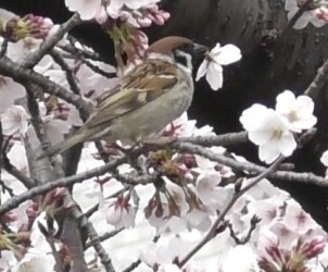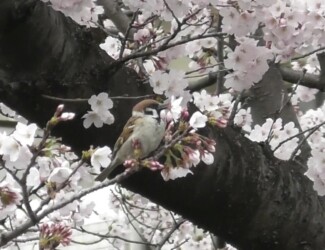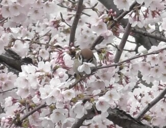 4月初旬になって団地を流れる用水路脇のソメイヨシノの花が咲き出すと、メジロ、ヒヨドリやスズメが花の蜜を求めて集まります。