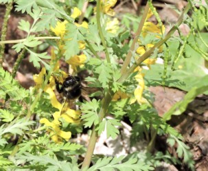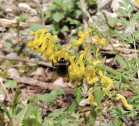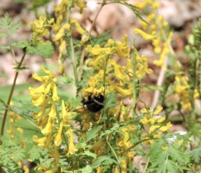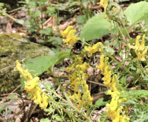 春に東根の関山峠の山道を歩いていたときに、ミヤマキケマンが咲いているところで、マルハナバチが花の距(きょ)近くの部分を食いちぎって蜜を吸っているのを見かけました。