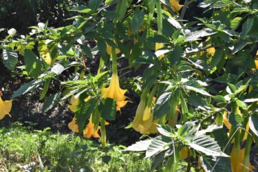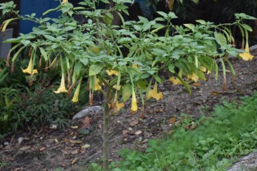 ENERGREEN(植物図鑑)には「3~10mほどになる低木または小高木。葉は互生する単葉で、大きく、縁が波状または全縁となります。花は葉腋に単生し、長さは10㎝~50㎝ほどになる先端が大きく開いたラッパ状~筒状で下向きに咲きます。花冠は浅く5裂し、先端は角状にとがって反転します。花筒の首部は細くくびれます。花は夜に香るものが多いです。花色は白やオレンジ、黄色、ピンクなどがあり、八重咲のものもあります。萼は長い筒状です。~中略~ 暖地では大きく育てることができ、花のつきの良いものであればのべ100輪以上の花が咲きます。増殖は実生か挿木、取木によります。害虫としてヨトウムシやハダニがあります。アルカロイドなどを含む有毒植物です。~中略~ 日本で広く栽培されているものは本種であることは少なく、多くが交配品種です。」と記されています。