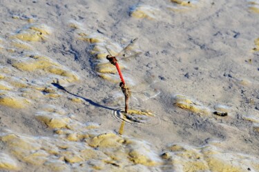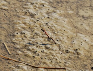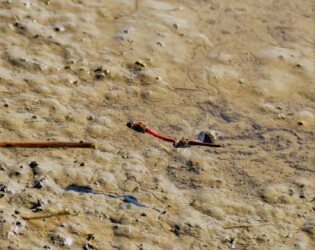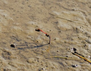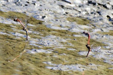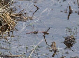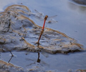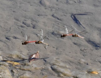 アキアカネは打水と打泥産卵のどちらも行いますが、産卵するときは真ん中でなく水辺の縁で産卵しています。