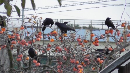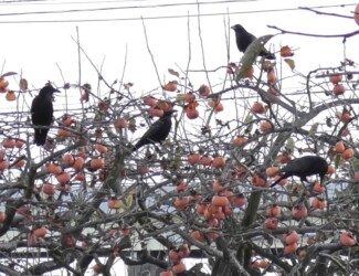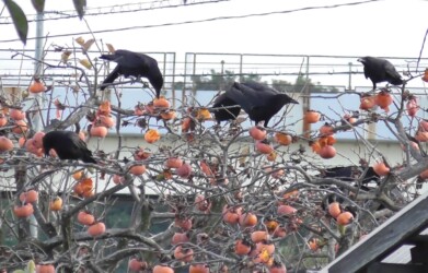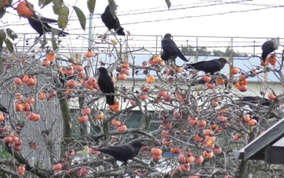 カキの実に集まるのはスズメ、ムクドリ、ヒヨドリ、カラスやメジロなどです。