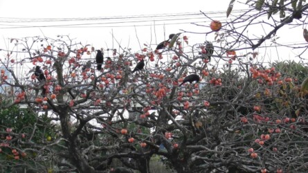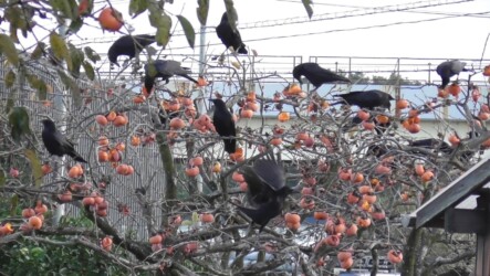 愛西市善田川大井橋の土手付近で、たくさんのカラスがカキの実を啄んでいるのを見かけました。