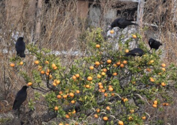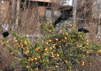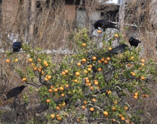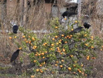 善田川の他の場所でミカンの実を啄んでいるカラスを見かけました。