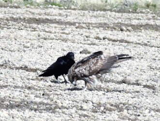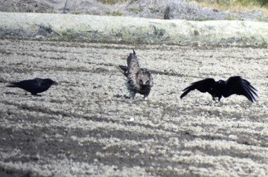畑で1羽のカラスが何かを啄んでいると、他のカラスが横取りしようとやって来ました。