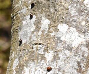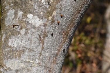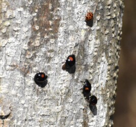 テントウムシが木の幹にたくさん集まっていた