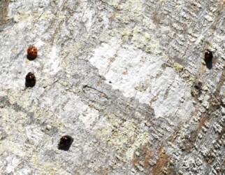 11月初旬に山形市高瀬の奥羽山脈の麓の山道を歩いていたら、1本の広葉樹の幹にたくさんのテントウムシが集まっていました。