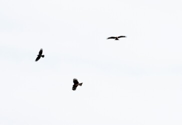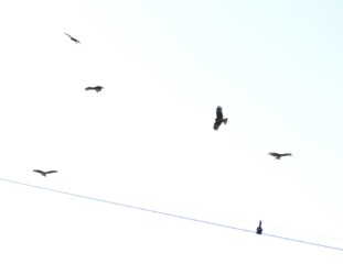 冬に工場の上空をトビが風を受けながら悠々と飛んでいると、カラスが数羽で追いかけていきます。