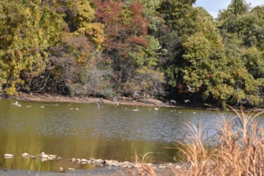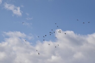水辺に近づくとマガモの群れは一斉に飛び立って、何回か沼の上空を旋回してから飛んでいきました。