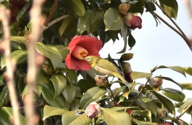 ツバキの蜜を吸うメジロ