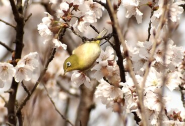 サクラの蜜を吸うメジロ