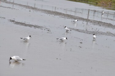 ズグロカモメでは「冬鳥。干潟、河口など。全国に記録はあるが、関東地方以西に局地的に渡来する。九州北部に特に多い。日本への渡来数は近年増加傾向にある。広い干潟などで点々と百羽以上見られるところもあるが、それぞれが1羽で行動し、群れで行動することはない。浅い水辺や干潮の干潟の上空を飛び回り、水中にダイビングしたり、着地して主にカニをとる。」と記されています。