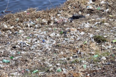 善田川と日光川の河口の合流点付近のどちらの川のヨシ原にも大量のプラスチックゴミが散乱しています。