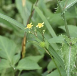 またキツネノボタンは「キンポウゲ科キンポウゲ属の多年草。~中略~ 川や水田の近くなど湿り気のある土地に生える。草丈は30~60㎝。根生葉は葉柄が長く、一つの柄に3枚の葉がつき(3出複葉)、それぞれの小葉に切れ込みがある。茎生葉は上に行くほど柄が短いものが互生する。5~7月ごろ分岐した茎の先に黄色い5弁の花が咲く。花の直径は1~1.5㎝で花弁に光沢があるのが特徴。花後にコンペイトウのような角のある直径1㎝ほどの果実がつく。果実は集合果で、角状の突起それぞれが1つの実であり、その形状は扁平で先端は鈎状に曲がっている。」と記されています。