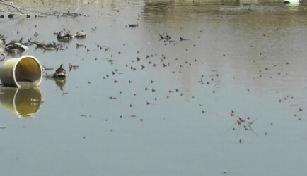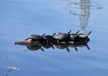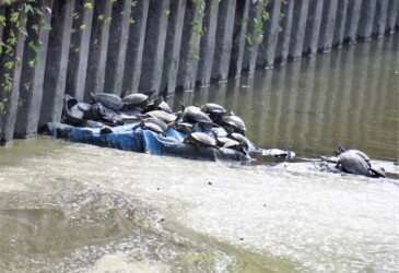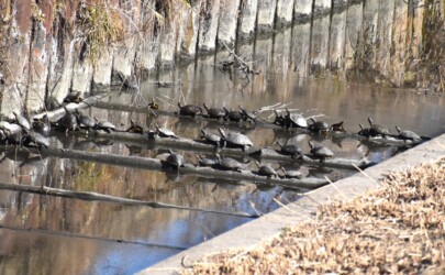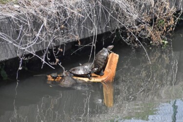 また弥富市宝川土手下の用水路では、アカミミガメが用水路上に架かる木の板に並んで甲羅干しをしています。