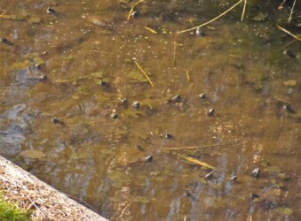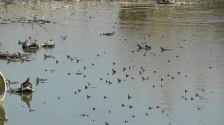 沼の雑木林にカワセミがいないかと近づくと、岸辺に上がっていたカメが一斉に水中に逃げていきます。