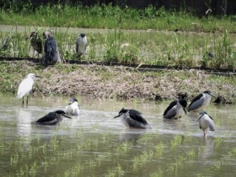 東名阪道の蟹江インター内のサギのコロニーでは、育雛に疲れた親だと思われるゴイサギが田んぼにやってきて、用水路の土手にとまって休憩していますが、ときどき田植えが終わった水田で何羽も水浴びしています。