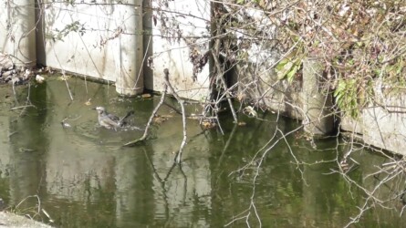 その水浴びしている時期は真夏だけかというと、そうではなくヒヨドリは真冬の氷が張っている用水路の水溜まりで水浴びしていました。