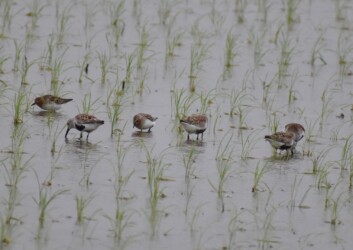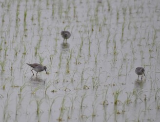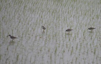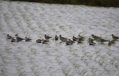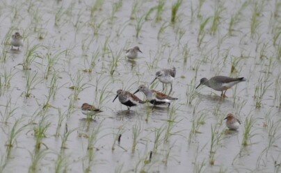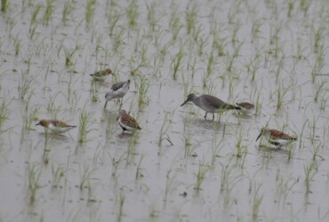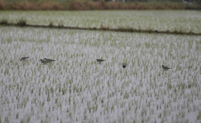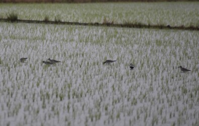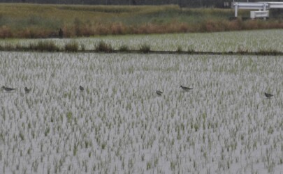 1昨年の5月の雨が強く降っていた時期に、シギの大きな群れが田植えの終わった田んぼで餌採りをしていました。