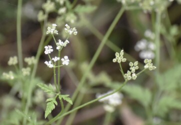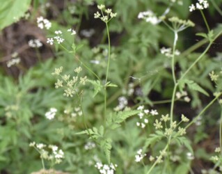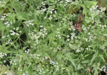 「日本の野草」(林弥栄編 山と溪谷社)には「野原に多く生える越年草。茎は直立し枝分かれし、高さは30~80㌢になる。葉は2~3回羽状複葉で長さ5~10㌢、羽片は細かく分裂しやや厚く、両面にあらい短毛がある。複散形花序を数個だし、さらに小散形花序をつくり、小さな白花をやや密に開く。花弁は5個で内側に曲がる。果実は褐色で卵状楕円形で、刺状の毛が密生し、先端はかぎ状に曲がり、動物に付着して種子を散らす。花期 5~7月 生育地 野原 分布 日本全土」と記されています。